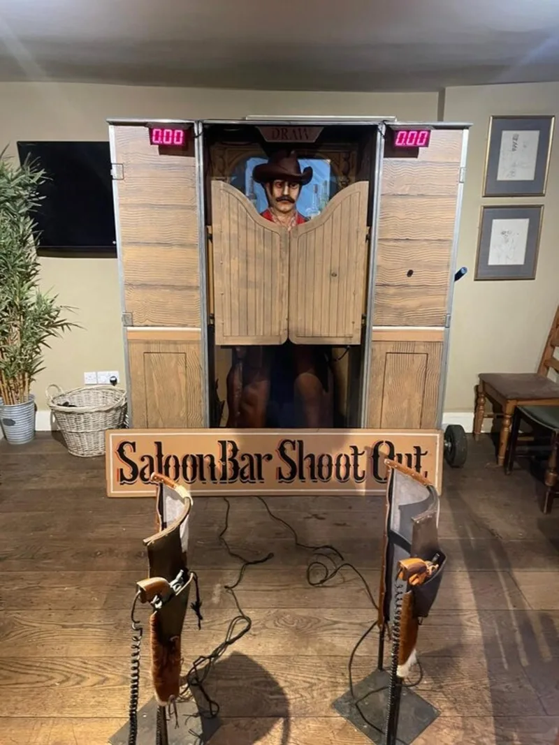 Want a Saloon Showdown at your event? Hire the Quick Draw Shoot out Game here today! Step into the dusty boots of an Old West gunslinger in Saloon Bar Shoot out, the ultimate quick-draw shootout game! In this high-stakes battle of reflexes, wits, and nerve, players face off in a tense saloon standoff. The goal? Outdraw your opponent and prove you're the fastest gun in the Wild West. The Saloon Bar Shootout combines fast-paced action with authentic Western flair, making it a thrilling centrepiece for any venue or event. Our full sized illuminated Quick Draw Saloon Bar Shoot out interactive game is available to hire alone or along side a Rodeo bull or a extra add on to your western package. We hire nationwide including Kent, London and Essex, from young farmers markets in Dover, Folkestone and Wales to western themed events in Eridge Green and Shoreditch, hire your interactive Saloon Bar Shoot Out here today.